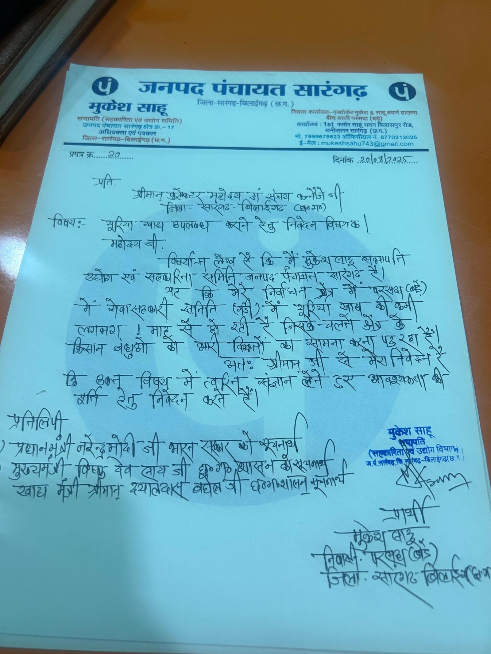 सारंगढ़-बिलाईगढ़!! यूरिया खाद की कमी अभी वर्तमान समय में पूरे छत्तीसगढ़ प्रदेश की सुर्ख़ियाँ बनी हुई है प्रदेश के किसान वर्गों में खाद के कमी को लेकर आक्रोश देखा जा रहा है! यूरिया खाद की क़िल्लत में सारंगढ़ ज़िला अछूता नहीं है! सारंगढ़ बिलाईगढ़ ज़िले के जनपद पंचायत सभापति मुकेश साहू जो अपने क्षेत्र के संवेदनशील नेता माने जाते हैं उन्होंने सारंगढ़ कलेक्टर डाक्टर संजय कनौजे को प्रधान मंत्री नरेंद्र मोदी और प्रदेश के मुख्यमंत्री को सूचनार्थ करते हुए यूरिया खाद की कमी के लिए ज्ञापन सौंपा है!