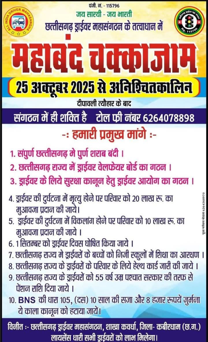 शराबबंदी अऊ अन्य मांग ल लेकर के छत्तीसगढ़ के सबो ड्राइवर मन 25 अक्टूबर 2025 से स्टेयरिंग छोड़ो आंदोलन,महाबंद, चक्काजाम आंदोलन अनिश्चितकाल बर शुरू*